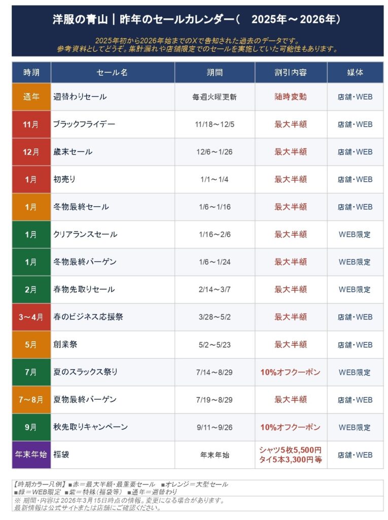 特に3月決算前後(春のビジネス応援祭・WEB限定春物先取りセール)は割引率が高い。